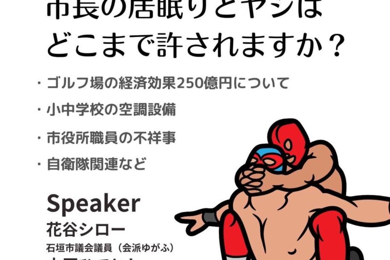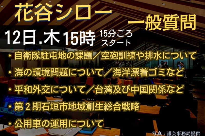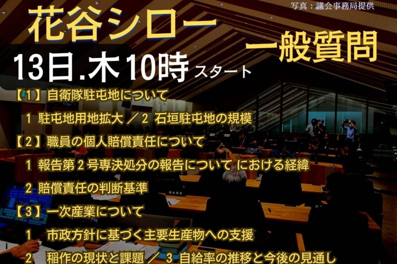 石垣市議会議員 花谷シローとタモリ英伸、内原ひでとしの3人で行動する石垣市議会の会派ゆがふです。石垣市政の動向や暮らし全般、軍事問題など発信しています。