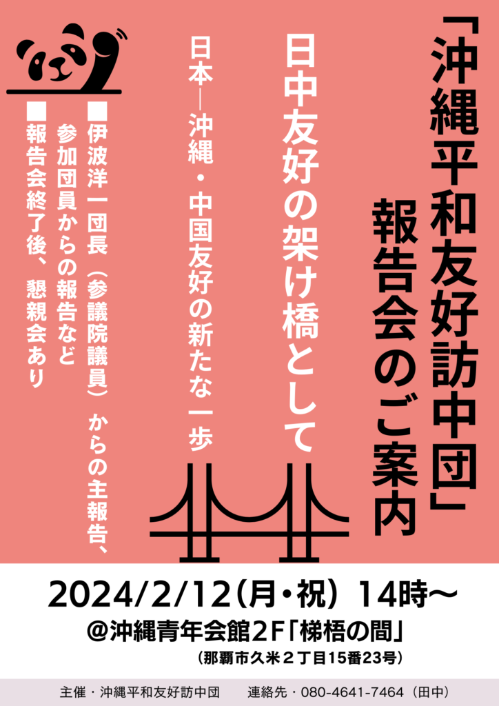 イベント出演 【イベント】「沖縄平和友好訪中団」報告会へ出演します。 Tweet 2024.02.07 by Press 0 「沖縄平和友好訪中団」報告会へ出演します。 ぜひ、ご参加ください。 SNSやLINEで、あなたのご家族、お友達などに広めてください。 「本当のしあわせをシロー」石垣市議会議員 花谷シロー公式サイト。「農業、環境、平和」を大切にしながら、持続可能な社会を構築していけるよう市民の皆様と共に、日々奮闘してます。島のしあわせを市民と築いていくために、多くの方々へ情報共有が必要です。シェアよろしくお願いいたします。